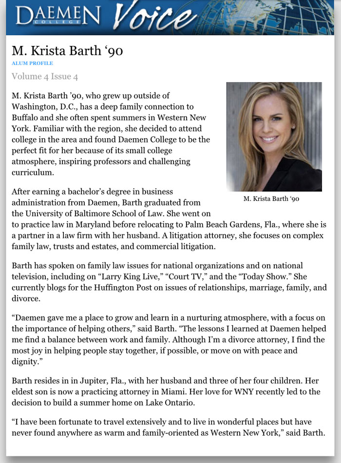 Krista Barth has spoken on family law issues for local and national organizations, including television appearances of "Larry King Live," "Court TV," and the "Today Show." She currently blogs for the Huffington Post on issues of relationships, marriage, family and divorce.